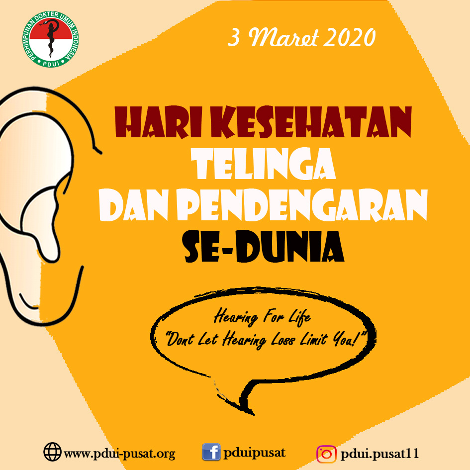 Jakarta, PP PDUI – Tanggal 3 Maret diperingati sebagai Hari Kesehatan Telinga dan Pendengaran Sedunia. Tujuan dari adanya peringatan hari kesehatan telinga dan pendengaran ini adalah untuk meningkatkan kesadaran masyarakat tentang bagaimana mencegah tuli dan gangguan pendengaran. Berdasarkan sejarah yang tercatat bahwa peringatan ini berawal dari pada Tahun 2007, dimana pada hari itu diadakannya Konferensi Internasional pertama tentang Pencegahan dan Rehabilitasi Gangguan Pendengaran. Konferensi di selenggarakan di Beijing oleh Pusat Penelitian Rehabilitasi Anak Tuna Rungu Cina (CRRCDC), Federasi Orang Cacat (CDPF) Beijing, Cina dan WHO. Konferensi tersebut menghasilkan satu deklarasi yaitu Deklarasi Beijing dan ditetapkannya Tanggal 3 Maret sebagai Internsional Ear Care Day. Sehingga sejak hari itu setiap Tanggal 3 Maret diperingati sebagai Hari Kesehatan Telinga dan Pendengaran Sedunia. Kemudian untuk di Negara Indonesia, peringatan tersebut baru dimulai pada Tahun 2010, dimana pemerintah menetapkan bahwa setiap Tanggal 3 Maret diperingati sebagai hari Kesehatan Telinga dan Pedengaran Nasional.